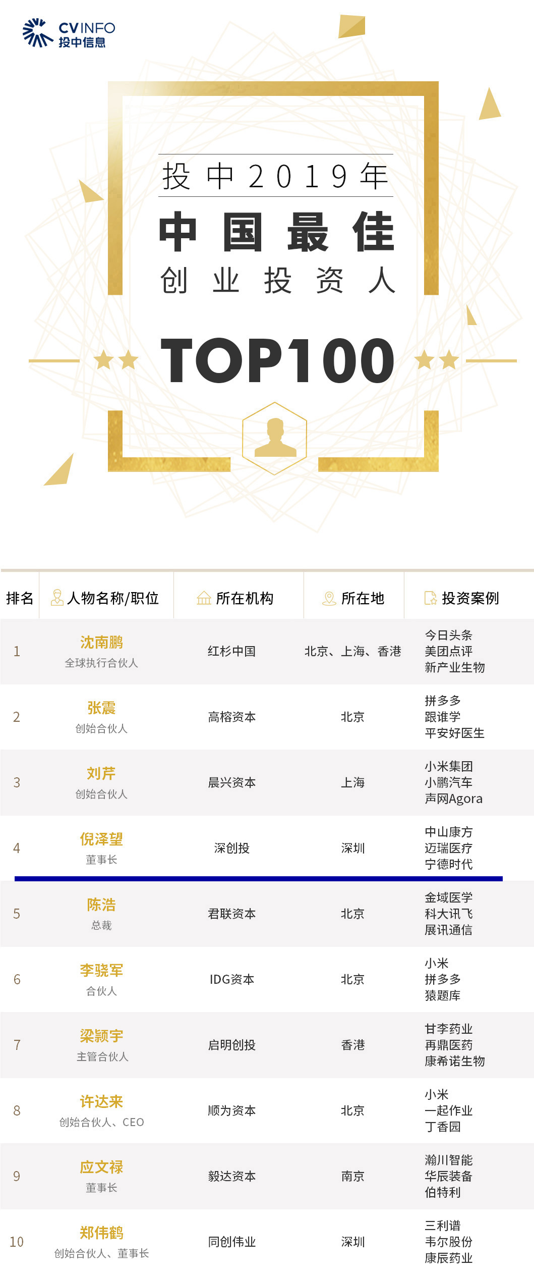 10月20日,投中信息发布“投中2019年最佳投资人”榜单,色色啦 (简称“色色啦 ”)董事长倪泽望获评“投中2019年中国最佳创业投资人TOP100”第四名、“投中2019年中国最佳先进制造产业投资人TOP10”。
