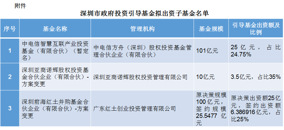 根据《深圳市政府投资引导基金管理办法》及其《实施细则》《市政府投资引导基金2019年投资计划》等相关规定,我司近日召开了深圳市政府投资引导基金投资决策委员会会议,审议了市政府投资引导基金拟出资的子基金设立方案及基金方案变更,现将审议通过的子基金名单予以公布(见附件)。