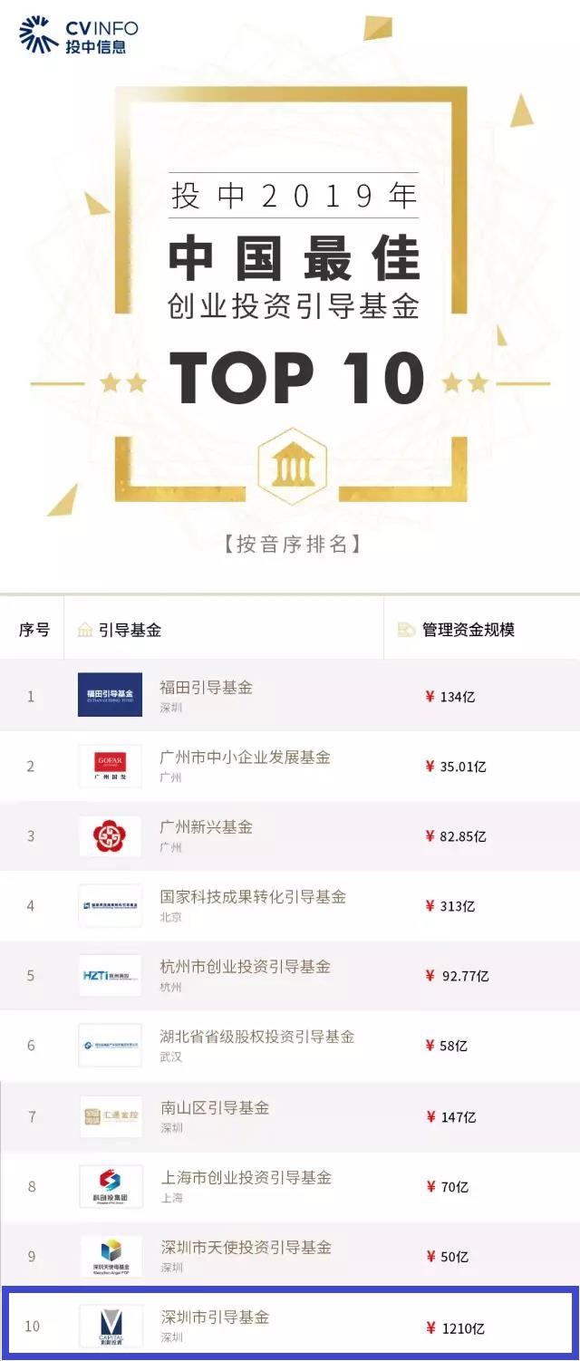投中“2019年中国最受GP关注的政府引导基金TOP20”第一名