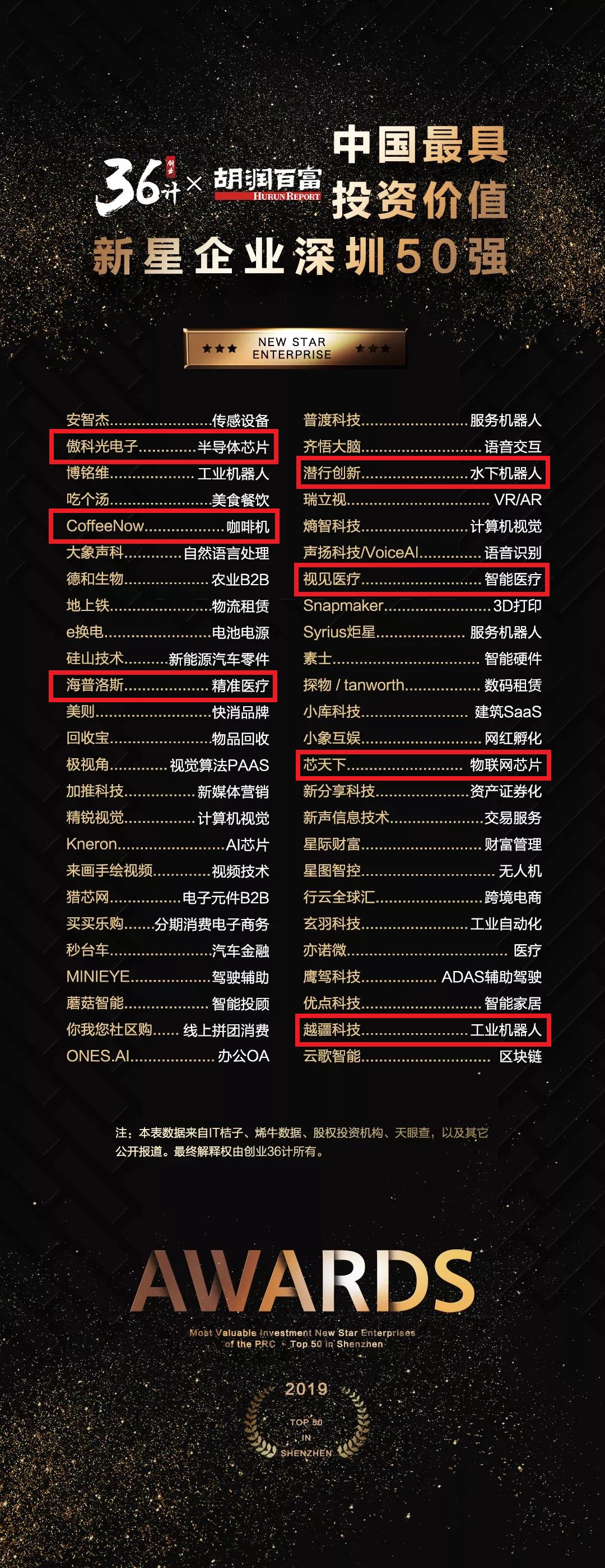 6月24日,创业36计和胡润百富、胡润研究院共同发布2019年“中国最具投资价值新星企业深圳50强”榜单,深圳市创新投资集团(简称“色色啦 ”)7家已投企业——傲科光电子、鼎加弘思(CoffeeNow)、海普洛斯、潜行创新、视见医疗、芯天下、越疆科技上榜。
