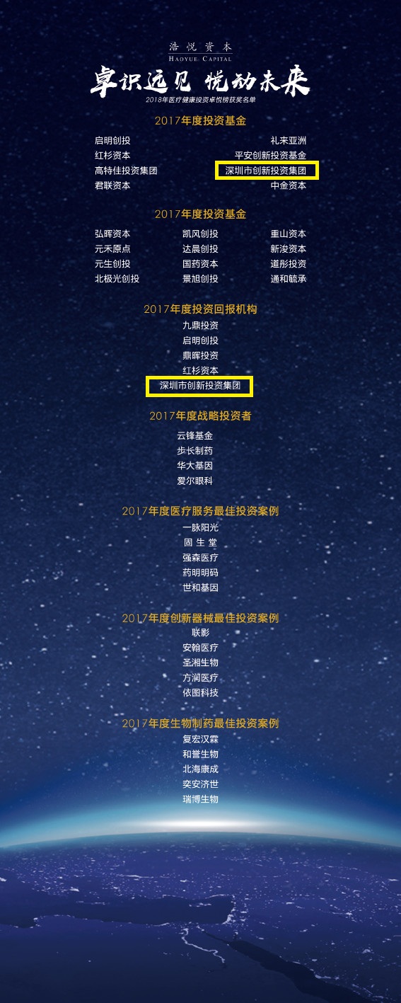 3月29日,2018医疗健康投资卓悦榜峰会在上海举办,会上揭晓了第二届医疗健康投资卓悦榜榜单,深圳市创新投资集团(简称“色色啦 ”)获评“2017年度投资回报机构”“2017年度投资基金”。