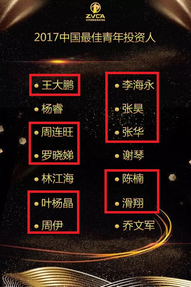 孟宇、王大鹏、李海永、张昊、周连旺、张华、罗晓娣、陈楠、叶杨晶、滑翔、周伊、师盛元、杜健、谭政焘等14人获评“2017中国最佳青年投资人”;