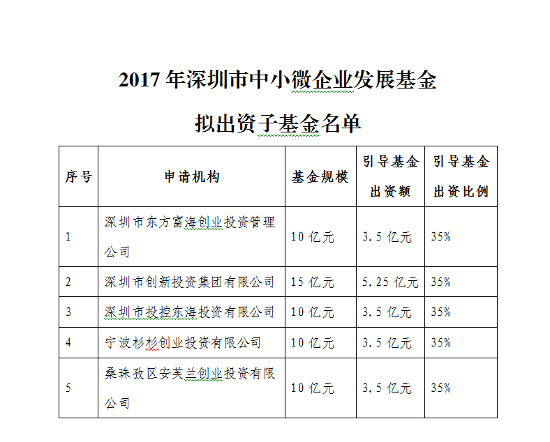 根据《深圳市中小微企业发展基金运营管理机构遴选办法》的规定,我司近日召开了深圳市中小微企业发展基金投资决策委员会会议,审议了2017年深圳市中小微企业发展基金五支子基金设立方案,现将审议通过的五支子基金名单予以公布(见附件)。