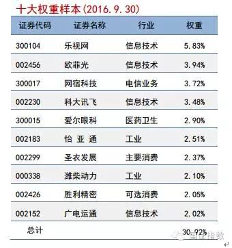截至2016年9 月底,指数样本股有 114只,占沪深两市同类企业的88%,凸显深市服务中小企业、创新企业的功能与特色。样本股绝大部分集中在中小板与创业板市场,分别占57只和56只。由于创投机构投资方向的特殊导向性,样本股更多地集中在高科技、创新性较强的行业,信息技术成为指数第一大权重行业。