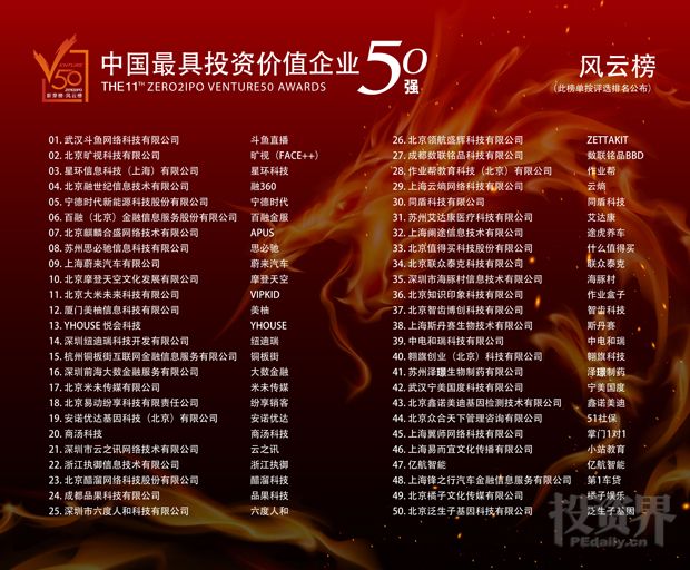 V50评选始于2006年,至今已举办十一届。该评选是投资界首个专注高成长企业的年度评选活动,被誉为“行业投资风向标”。 本届评选根据企业发展的不同阶段与规模,将榜单细分为“风云榜”(融资阶段A轮及其以后的未上市企业)和“新芽榜”(融资阶段A轮以前的未上市企业,创立时间两年以内)。评选自今年3月全面启动以来,广泛征集报名企业,经首轮筛选进入初评的企业逾千家,后通过严格的初评和复评,汇聚了近百位投资界“意见领袖”及精英们的专业意见,最终评选出上榜企业名单。