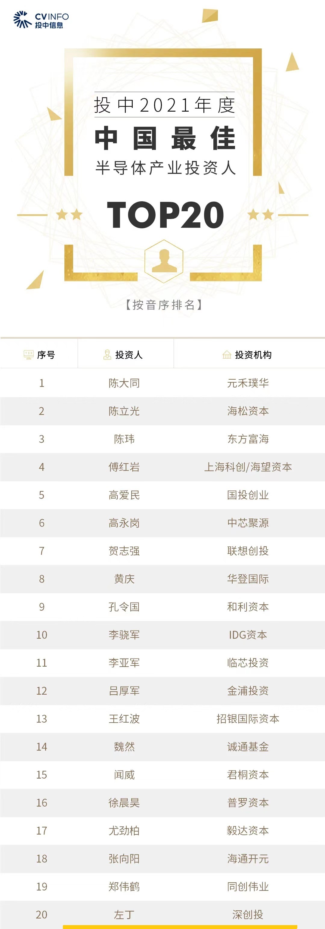 投中2021年度中国最佳半导体产业投资人TOP20