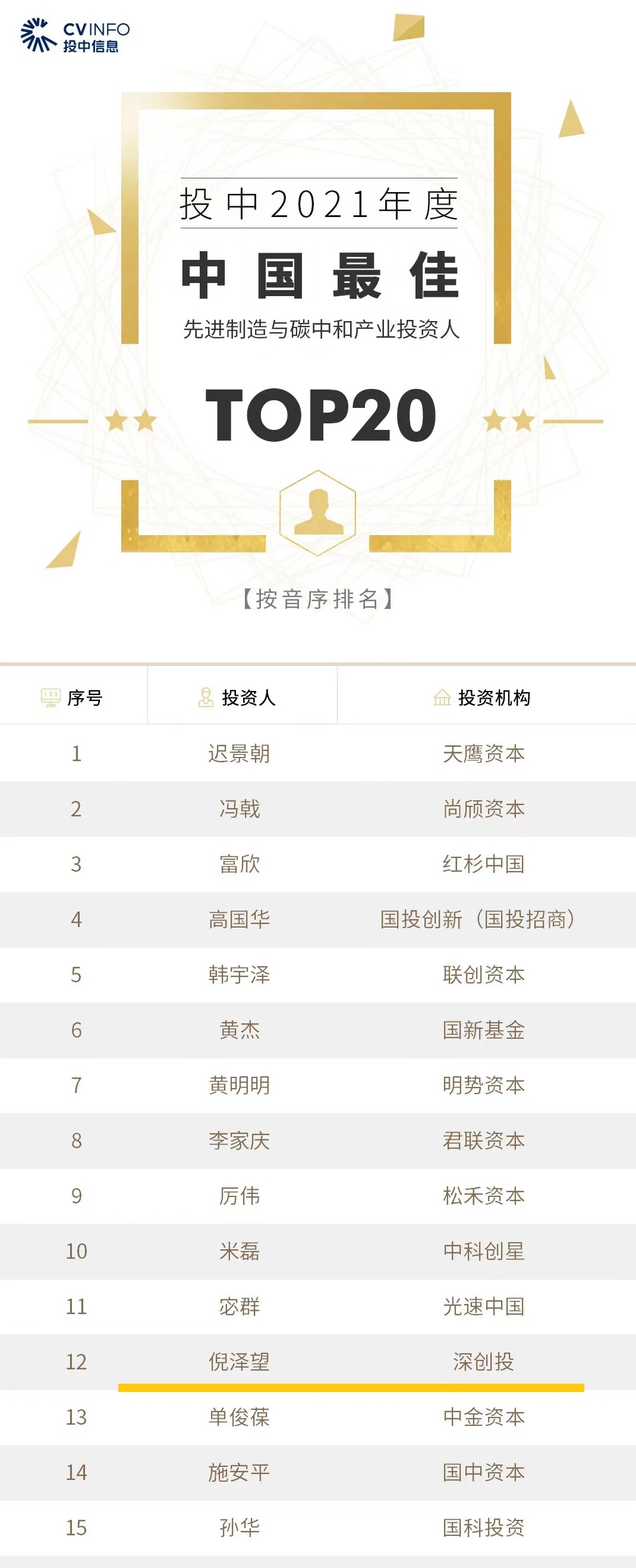 投中2021年度中国最佳先进制造与碳中和产业投资人TOP20