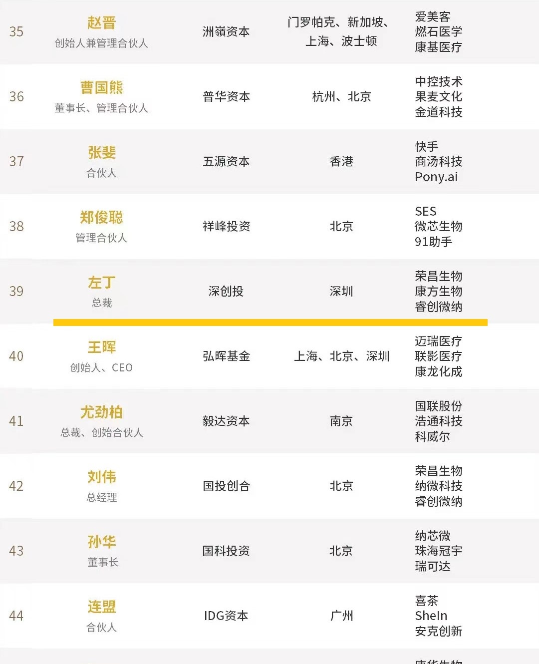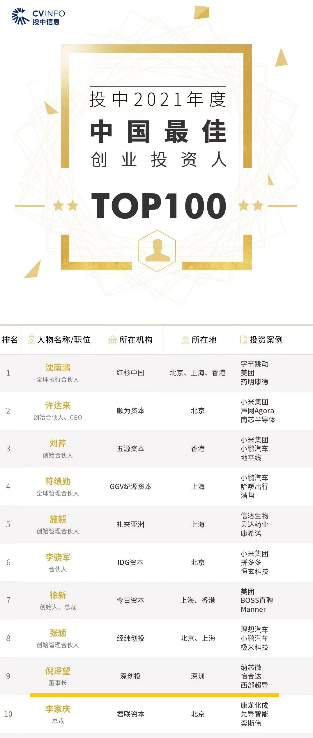 投中2021年度中国最佳创业投资人TOP100