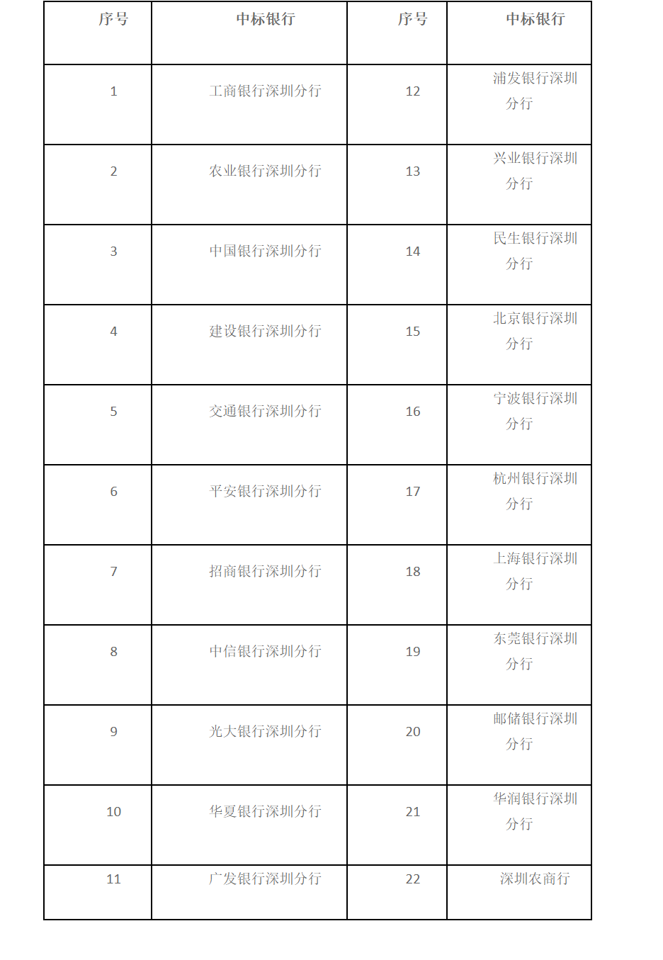 根据《2020-2021年深圳市政府投资引导基金待投资资金定期存款存放银行资格招标公告》及《2020-2021年深圳市政府投资引导基金待投资资金定期存款存放银行资格招标文件》的规定,现将2020-2021年深圳市政府投资引导基金待投资资金存放银行资格招标项目的中标结果公告如下(排名不分先后):
