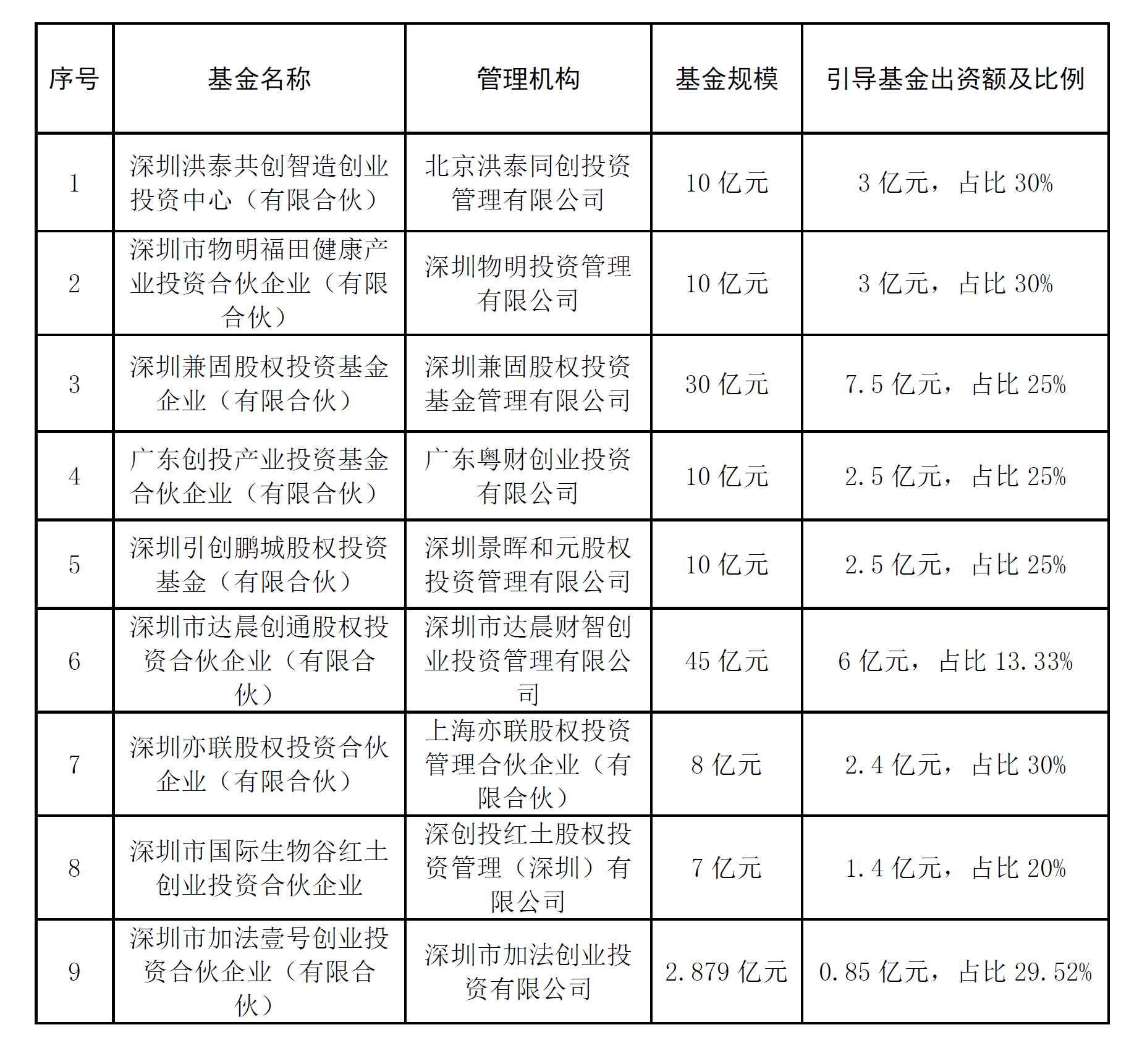 根据《深圳市政府投资引导基金管理办法》及其实施细则等相关规定,我司近日召开了深圳市政府投资引导基金投资决策委员会会议,审议了市政府投资引导基金拟出资的九支子基金设立方案,现将审议通过的九支子基金名单予以公布(见附件)。