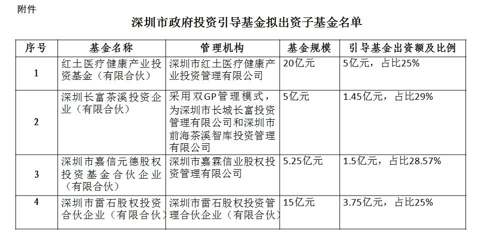 根据《深圳市政府投资引导基金管理办法(试行)》及其实施细则等相关规定,我司近日召开了深圳市政府投资引导基金投资决策委员会会议,审议了市政府投资引导基金拟出资的四支子基金设立方案,现将审议通过的四支子基金名单予以公布(见附件)。