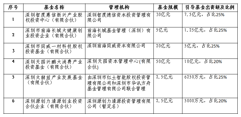 根据《深圳市政府投资引导基金管理办法(试行)》及其实施细则等相关规定,我司近日召开了深圳市政府投资引导基金投资决策委员会会议,审议了市政府投资引导基金拟出资的六支子基金设立方案,现将审议通过的六支子基金名单予以公布(见附件)。