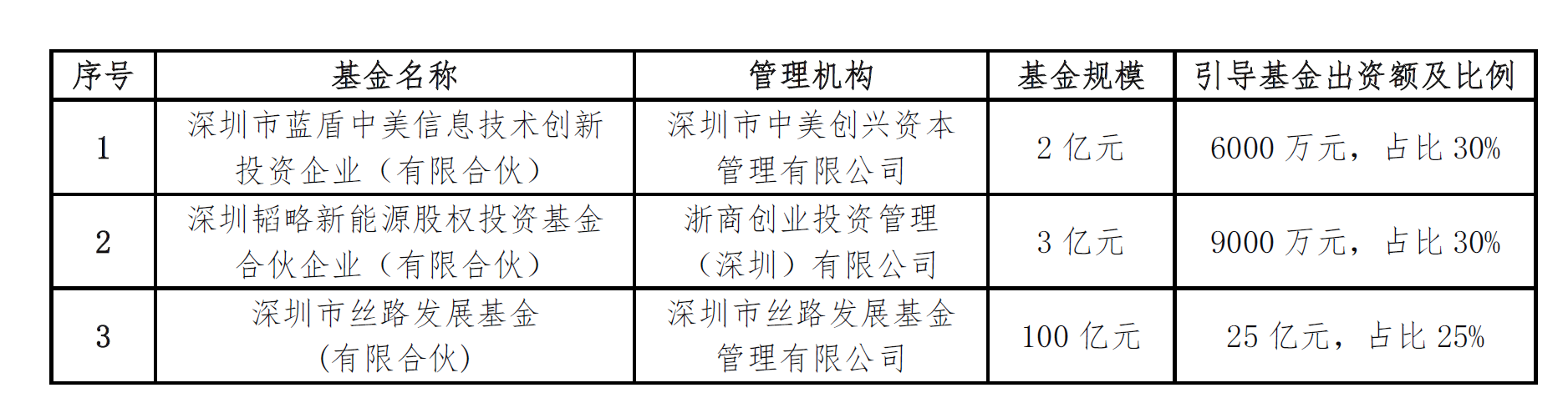 根据《深圳市政府投资引导基金管理办法(试行)》及其实施细则等相关规定,我司近日召开了深圳市政府投资引导基金投资决策委员会会议,审议了市政府投资引导基金拟出资的三支子基金设立方案,现将审议通过的三支子基金名单予以公布(见附件)。