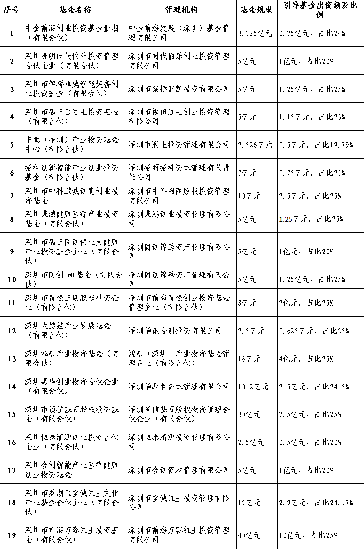 根据《深圳市政府投资引导基金管理办法(试行)》及其实施细则等相关规定,我司近日召开了深圳市政府投资引导基金投资决策委员会会议,审议了市政府投资引导基金拟出资的二十支子基金设立方案,现将审议通过的十九支子基金名单予以公布(见附件)。
