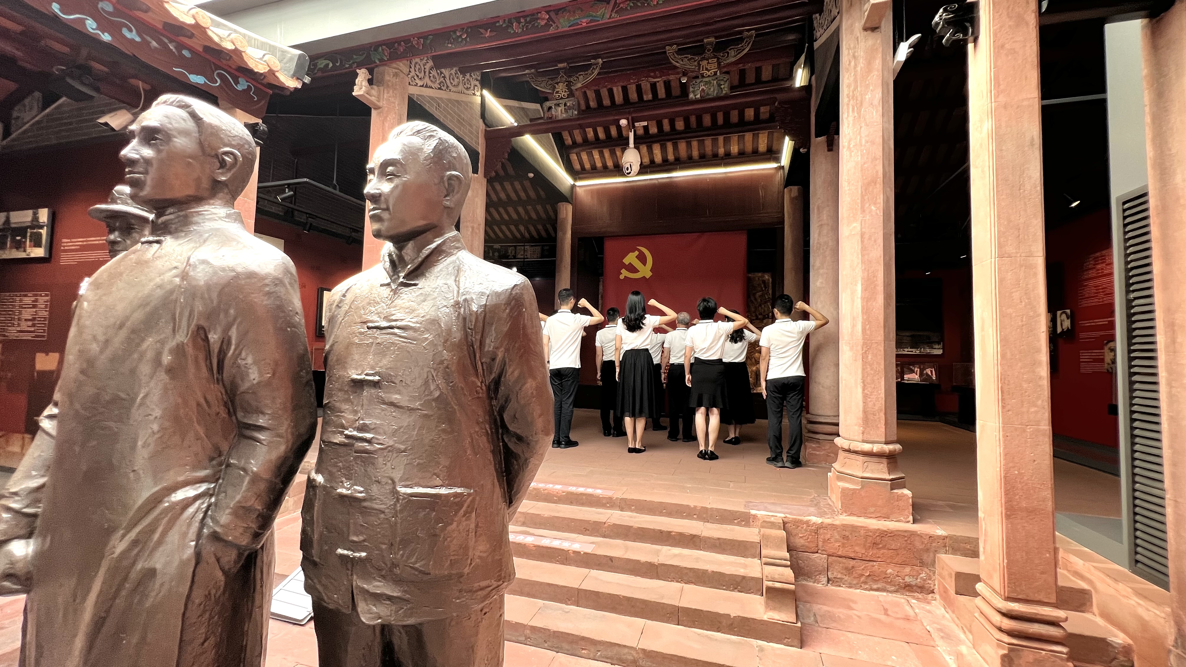 在中共宝安县第一次代表大会旧址,参加活动的党员干部现场瞻仰三位革命先烈的雕像,仔细观摩场内陈列的珍贵史料、革命文物、浮雕油画等,认真听取工作人员讲解中国共产党在宝安县领导人民开展革命斗争的历史,回顾党的峥嵘奋斗历程。随后,党员干部整齐列队,面向高悬于正厅中央的党旗,举起右手、紧握拳头,重温入党誓词。