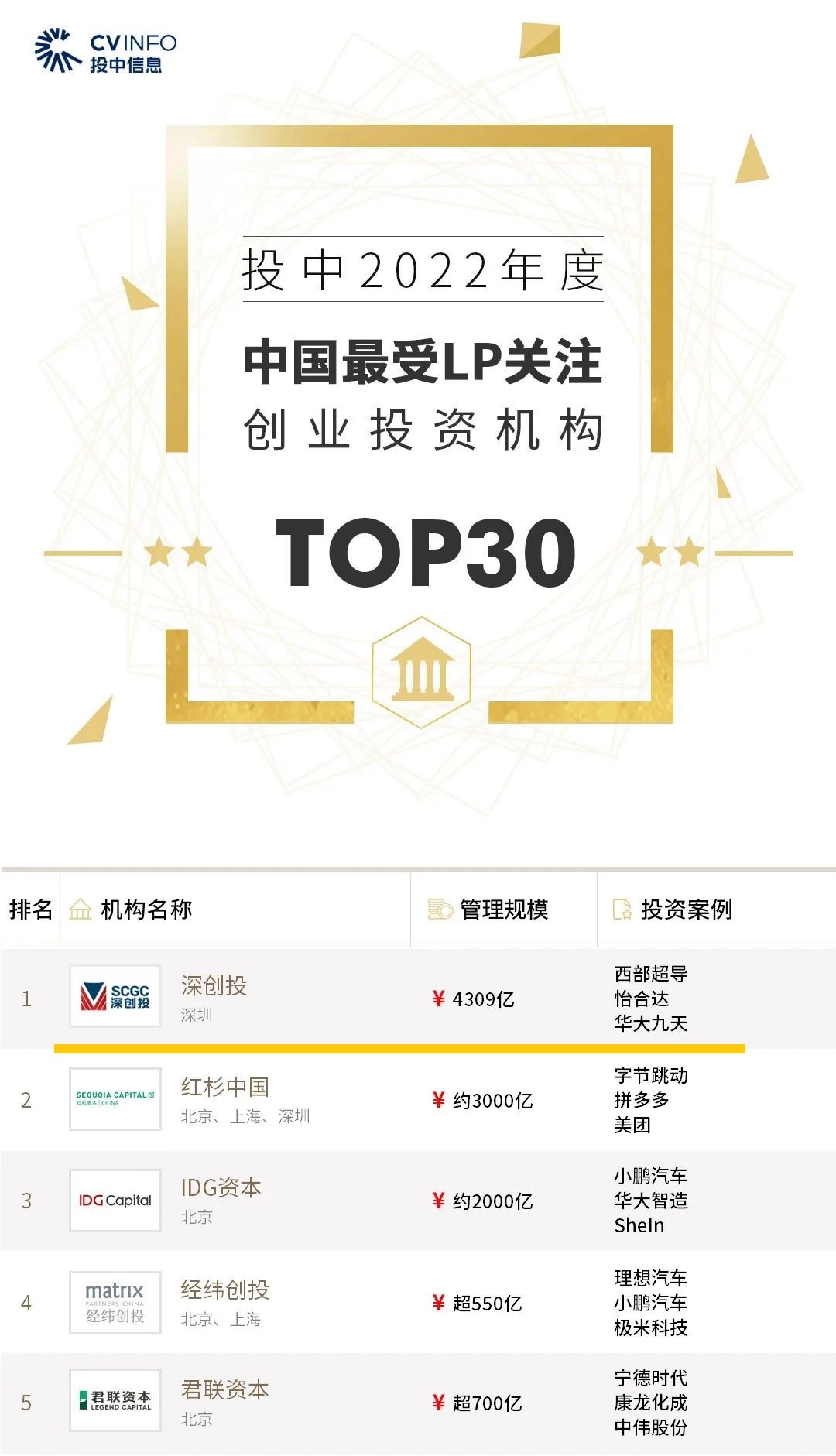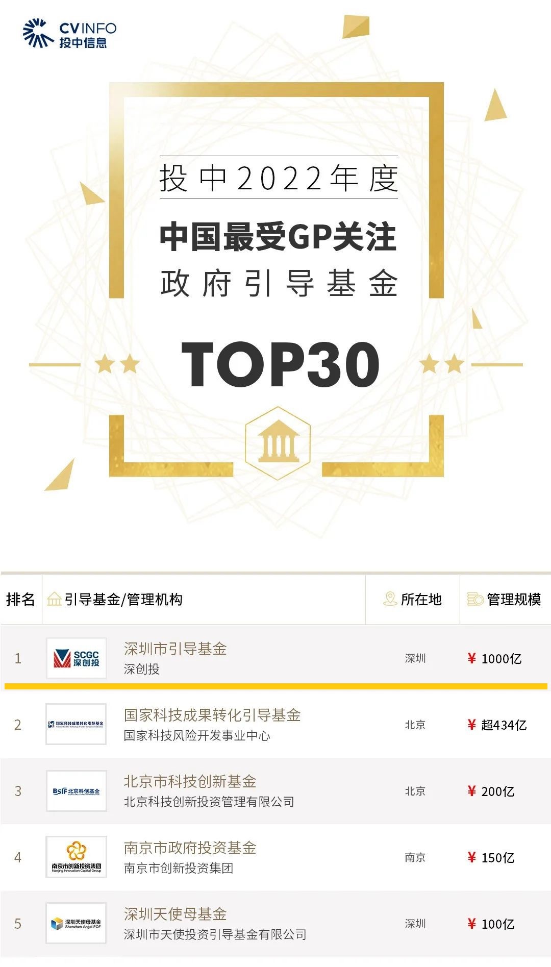 12月28日,投中信息发布2022年有限合伙人榜单,深圳市创新投资集团(简称“色色啦 ”)获评“投中2022年度中国最受LP关注创业投资机构TOP30”第一名,色色啦 受托管理的深圳市引导基金获评“投中2022年度中国最受GP关注政府引导基金TOP30”第一名。