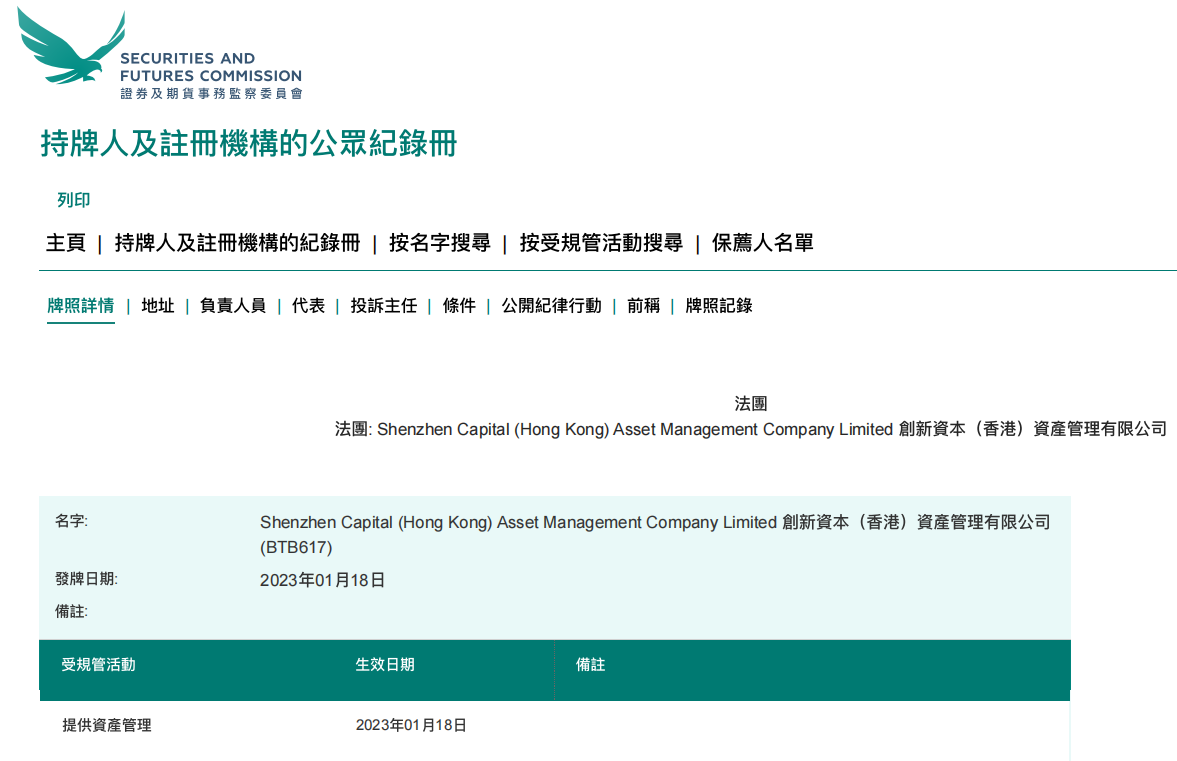 Shenzhen Capital (Hong Kong) Asset Management Company Limited had been granted the Type 9 (Asset Management) Licence by the SFC