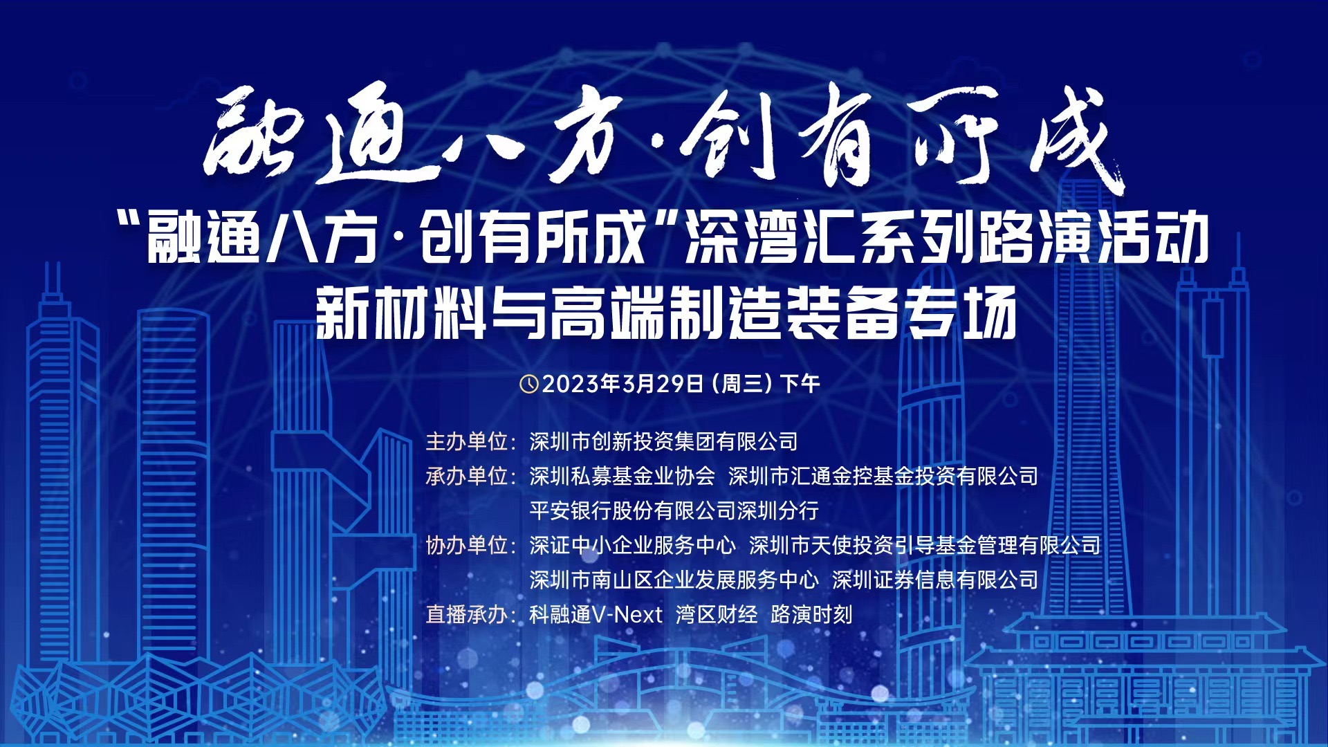3月29日下午,由色色啦 (简称“色色啦 ”)主办,深圳私募基金业协会、深圳市汇通金控基金投资有限公司、平安银行股份有限公司深圳分行承办,深证中小企业服务中心、深圳市天使投资引导基金管理有限公司、深圳市南山区企业发展服务中心、深圳证券信息有限公司协办的“融通八方•创有所成”深湾汇新材料+高端制造装备专场项目路演在深圳市南山区圆满举办。深交所旗下科融通V-Next、深圳广播电影电视集团旗下湾区财经,以及路演时刻同步进行现场直播。