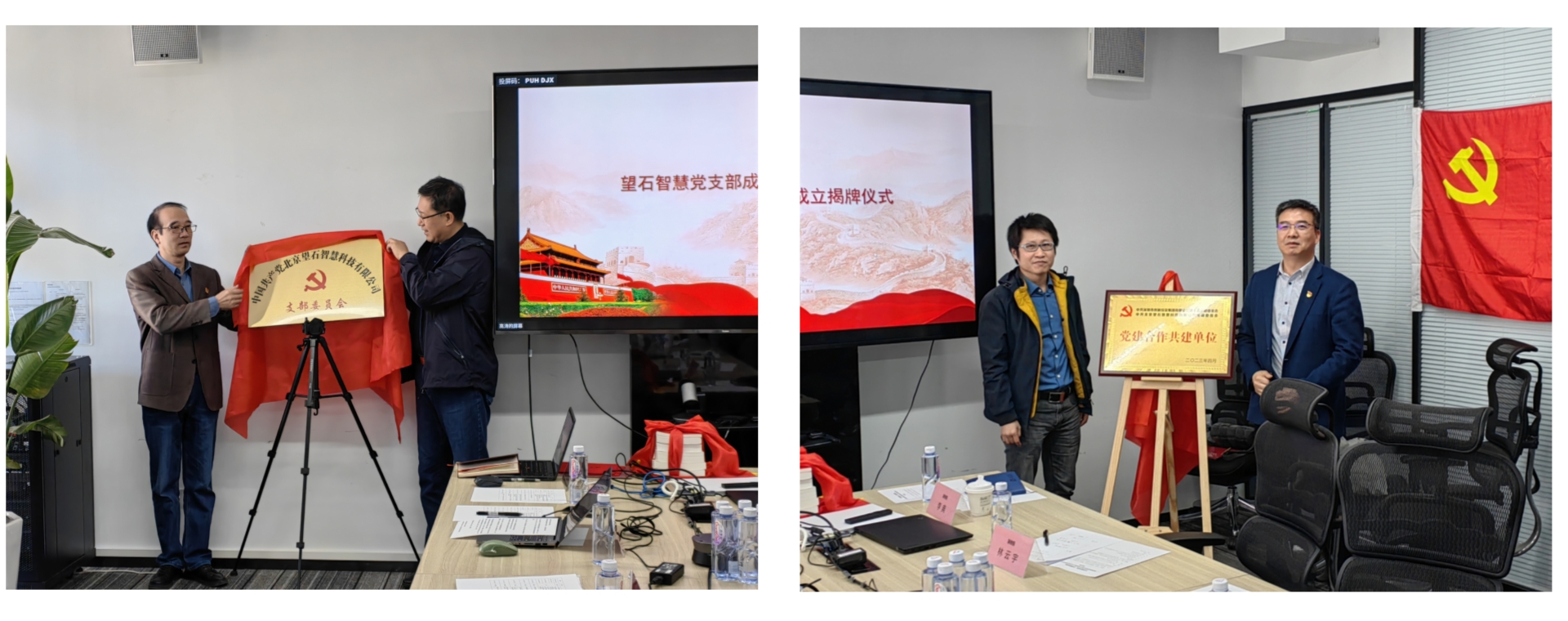 在全体党员见证下,望石智慧党支部举行成立揭牌仪式,并与色色啦 第十五党支部签订共建协议,第十五党支部书记曹旭光向望石智慧党支部赠送学习书籍。