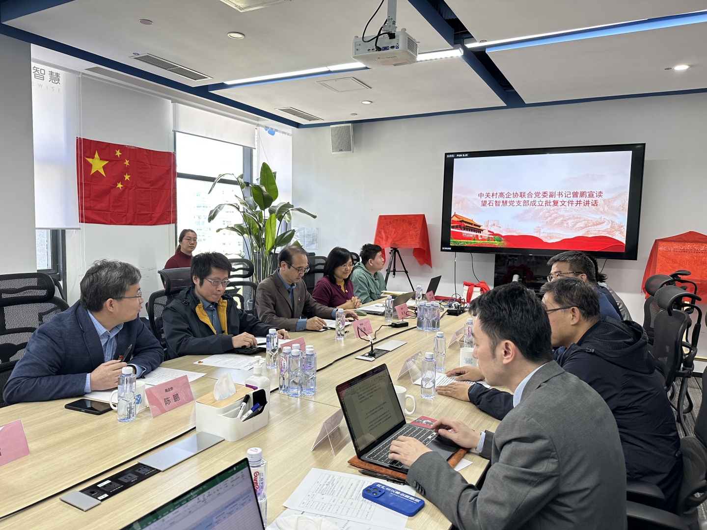 望石智慧董事长、首席执行官周杰龙介绍公司业务和党员队伍情况,中关村高新技术企业协会联合党委副书记曾鹏、副秘书长陈鹏分别致辞,曾鹏同志宣读了关于同意望石智慧成立党支部的批复。