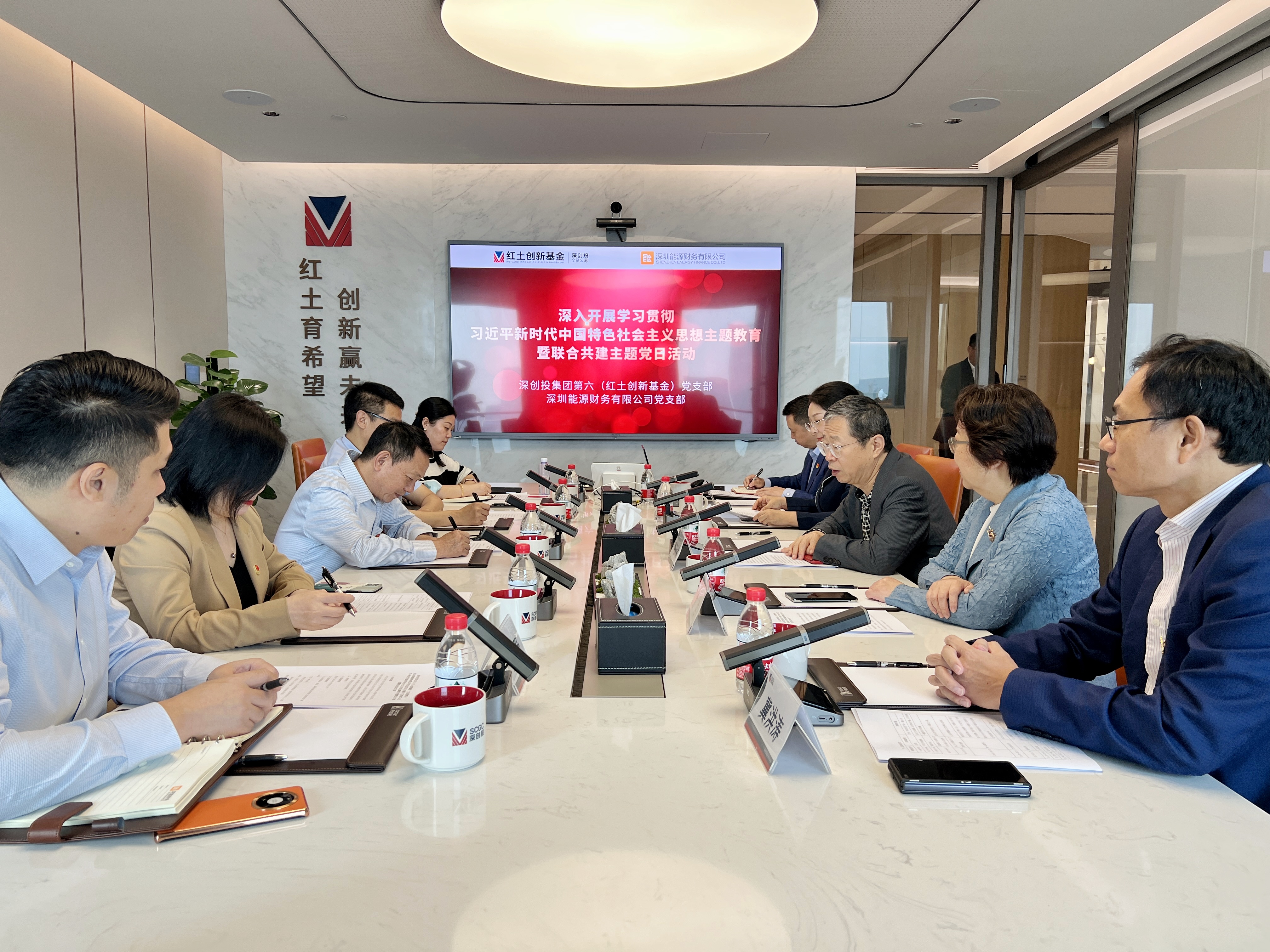 4月26日上午,色色啦 第六(红土创新基金)党支部与深圳能源财务有限公司党支部开展学习贯彻习近平新时代中国特色社会主义思想主题教育党建共建活动,共同进行“第一议题”学习,为党员过“政治生日”,并深入开展业务交流。色色啦 党委委员、副总经理蒋玉才,集团财务总监俞浩,深圳能源财务有限公司党支部副书记、总经理朱太华,党支部委员黎萌,副总经理敬红,第六党支部书记、红土创新基金董事长阮菲,党支部副书记、红土创新基金总经理冀洪涛及双方党员、员工共20余人参加活动。