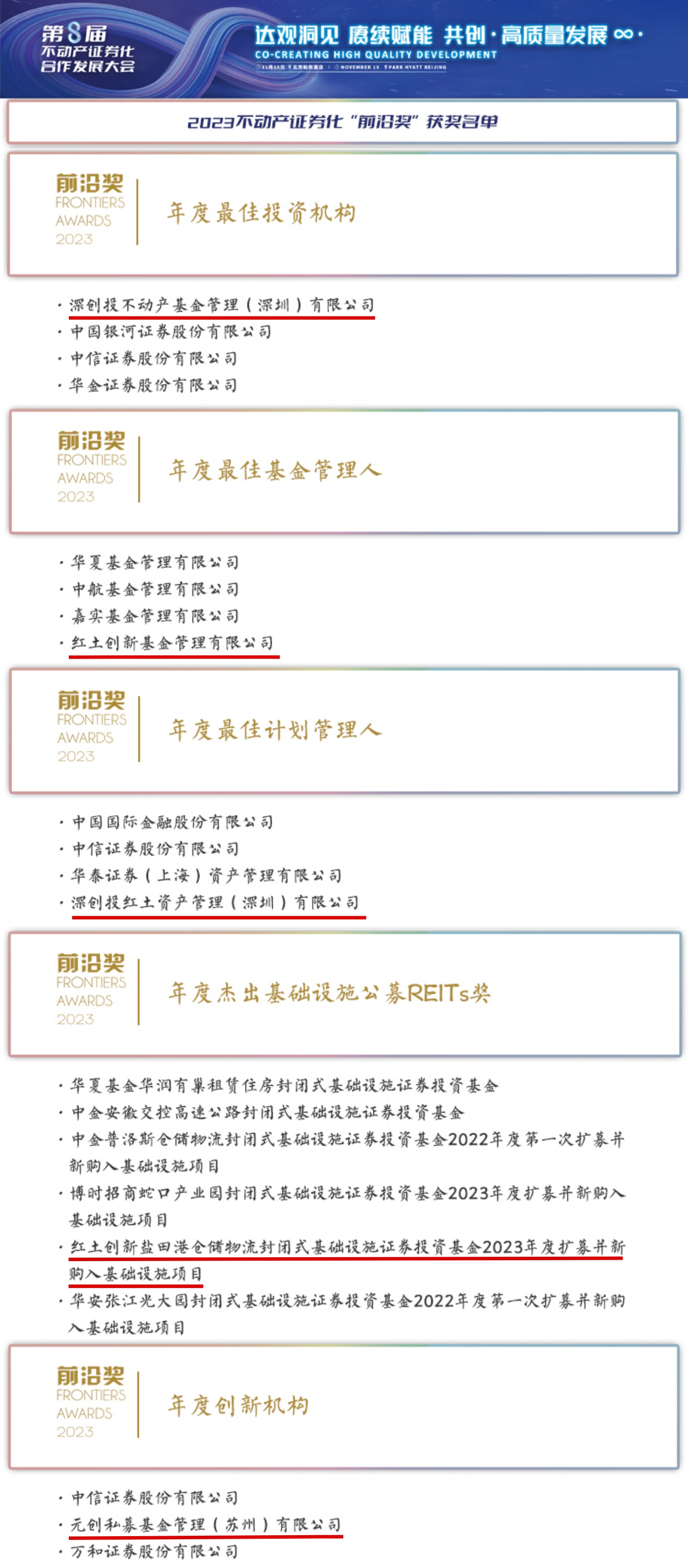 11月15日,由中国资产证券化论坛、中国金融前沿论坛、中国REITs50人论坛、REITs研究中心等联合主办的第八届不动产证券化合作发展大会暨2023年度不动产证券化前沿奖颁奖典礼在北京举办。经专家评审团评议与网络公开投票,深圳市创新投资集团(简称“色色啦 ”)下属公司及相关项目荣获多项荣誉: