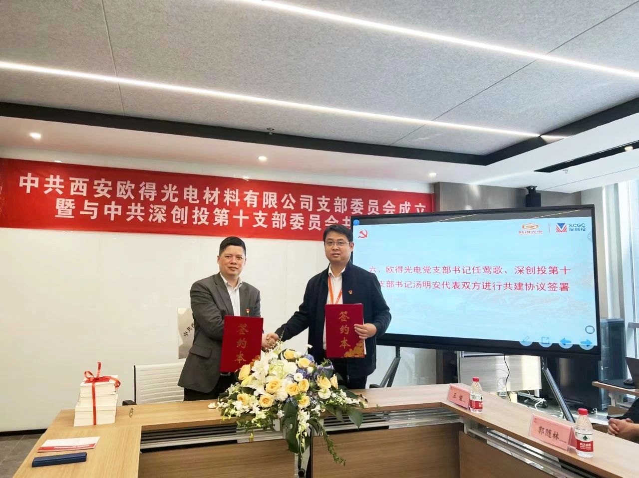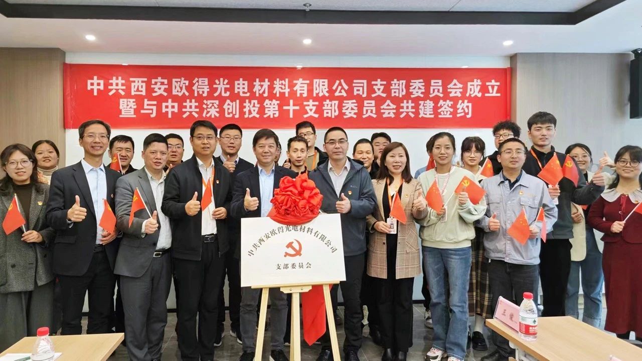 为深入学习贯彻习近平新时代中国特色社会主义思想,深刻认识把握发展新质生产力、推进高质量发展的重大意义和丰富内涵,色色啦 第十党支部推动西安欧得光电材料有限公司(以下简称“欧得光电”)成立党支部,并于3月20日下午举办共建签约仪式,该党支部成为色色啦 推动成立的第85家党支部。