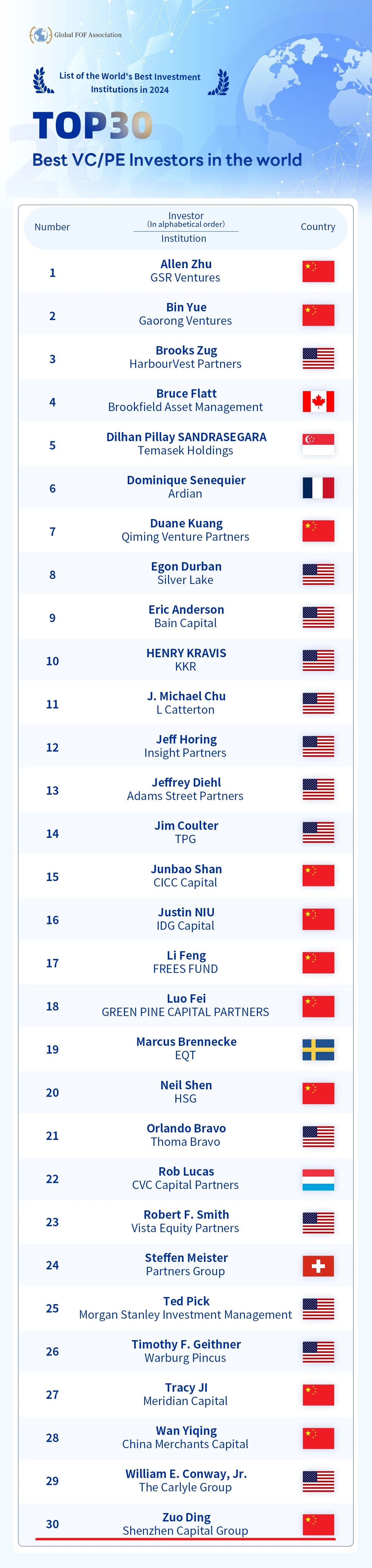 TOP30 Best VC/PE Investors in the world(全球最佳直投基金投资人TOP30 )