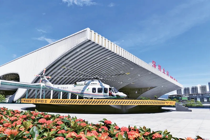 发展通用航空和低空经济是进一步全面深化改革的重要部署。图为2024年6月28日,直升机在深圳北站旁的停机坪等待起飞。当日,由深铁集团和东部通航合作共建的首个“低空+轨道”空铁联运项目在深圳北站枢纽东广场正式开航,将为旅客提供深圳空铁交通一站式接驳服务。新华社记者 毛思倩/摄