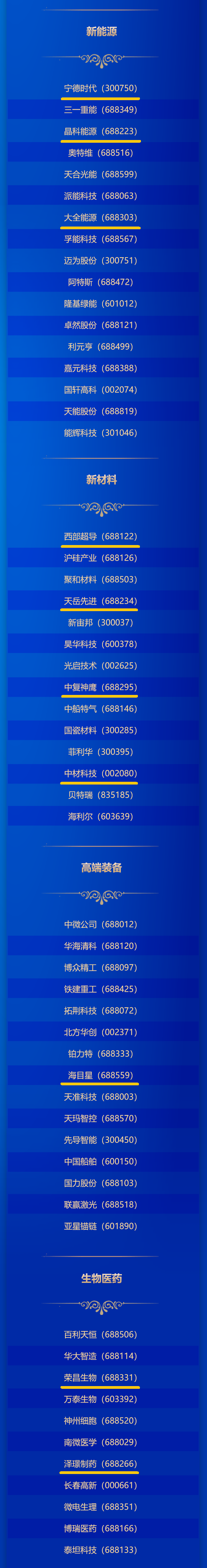 睿创微纳、华大九天、澜起科技、翱捷科技、中微半导、埃夫特、亿道信息、宁德时代、晶科能源、大全能源、西部超导、天岳先进、中复神鹰、中材科技、海目星、荣昌生物、泽璟制药