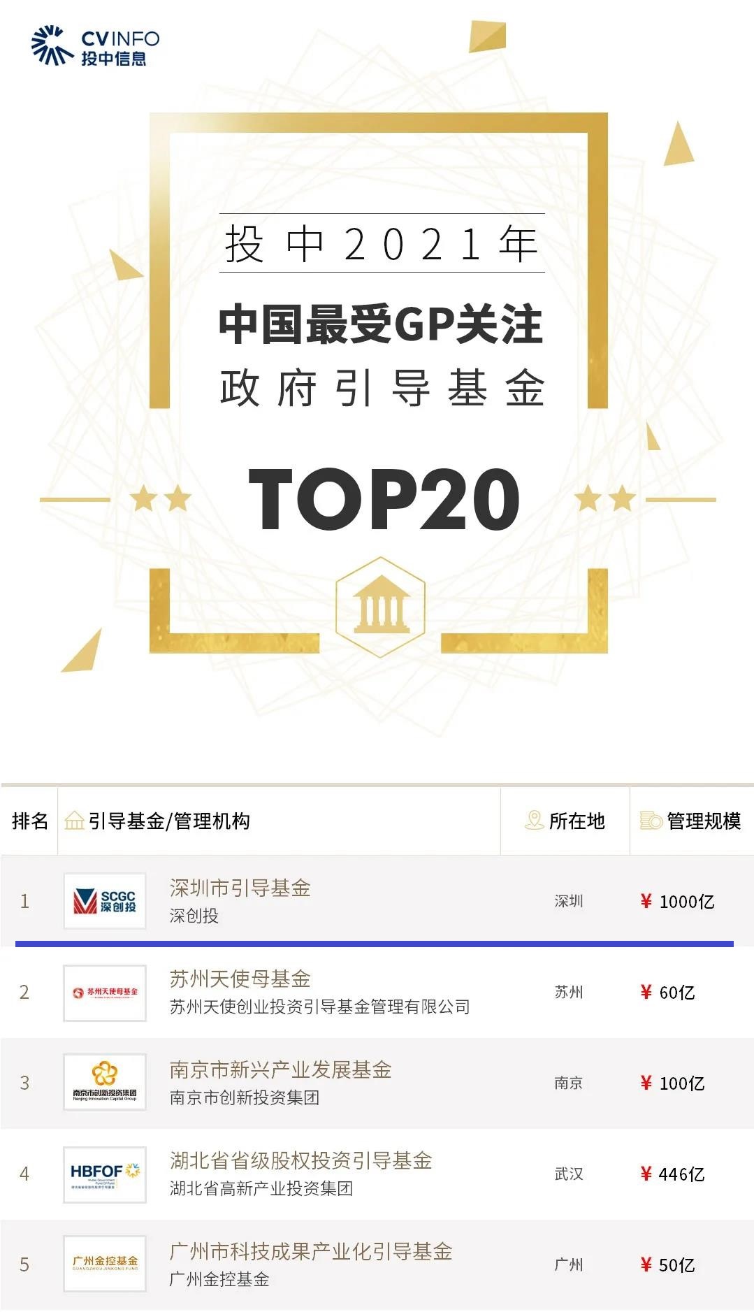 投中2021年中国最受GP关注政府引导基金TOP20第一名