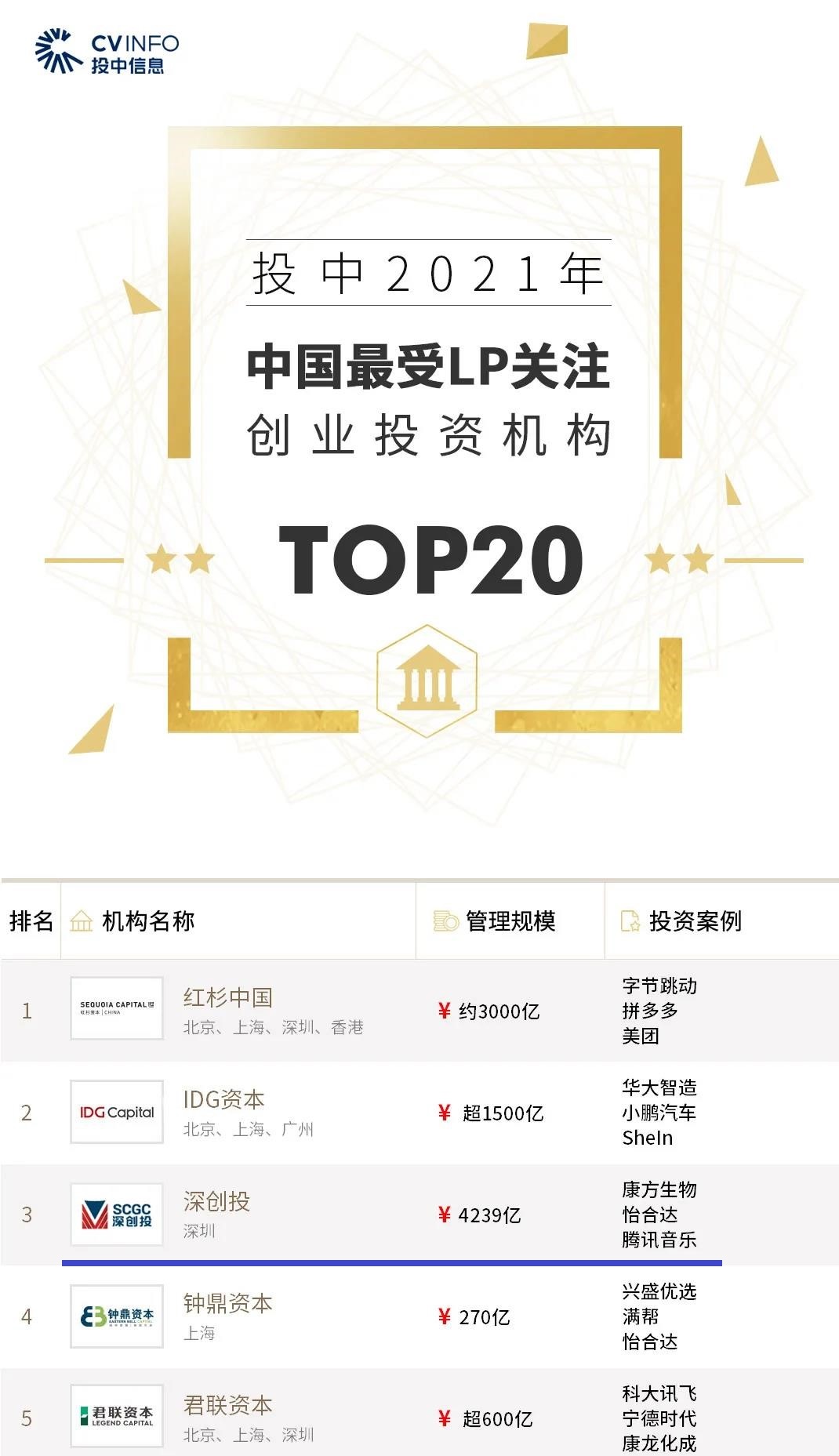 投中2021年中国最受LP关注创业投资机构TOP20第三名