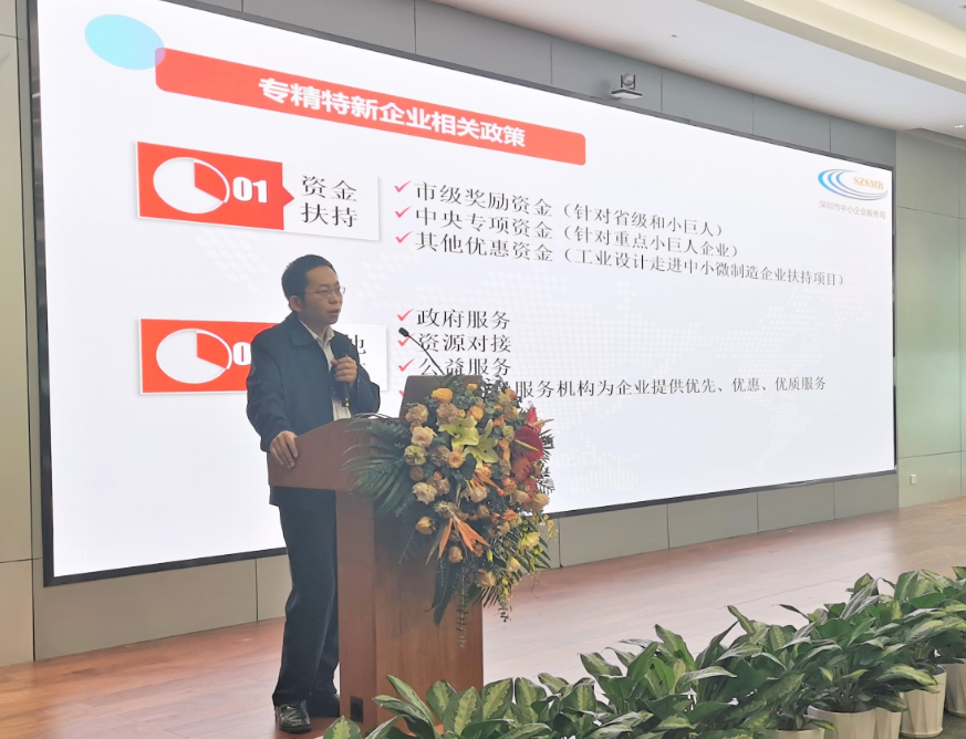 活动上,市中小局创新创业服务处李清义对国家、省、市有关专精特新中小企业的政策进行了深入解析,他提到:“《深圳市人民政府印发关于推动制造业高质量发展坚定不移打造制造强市若干措施的通知》中提出给予省级专精特新中小企业、国家专精特新‘小巨人’奖励。除直接对企业进行资金奖励之外,还包括一些项目扶持措施,如工业设计走进中小微制造企业扶持项目、质量品牌双提升项目扶持计划等措施。此外,银行也出台了针对专精特新的‘专精特新企业贷’,担保集团也出台了相应的担保产品等。”
