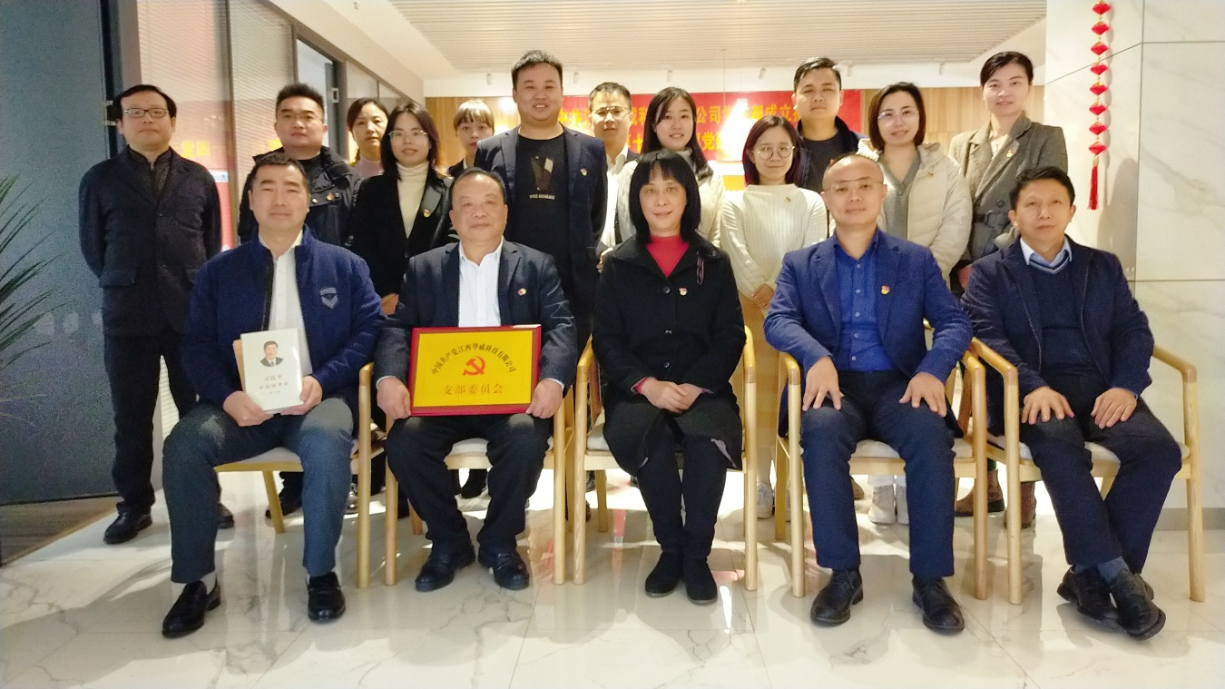 在全体与会党员的见证下,邓亮、张万华与李伶共同为江西华威党支部正式揭牌。