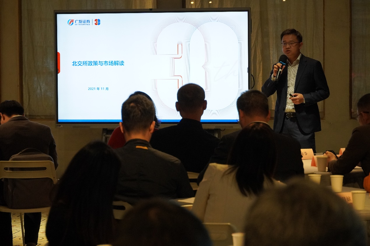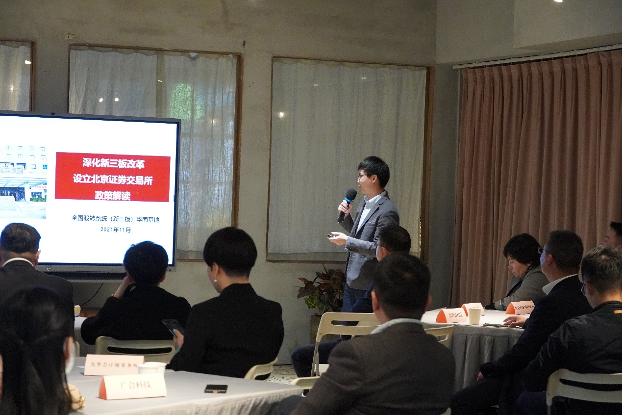 全国股转系统华南基地首席代表张荣和他的同事彭运雷带来《深化新三板改革、设立北京证券交易所政策解读》主题分享。彭运雷表示,北交所的成立是我国建立多层次资本市场体系的重要一环,正成为培育“专精特新”中小企业力量的汇聚高地。他简明清晰地向与会企业家介绍北交所的上市标准、申报流程以及与其他交易所板块的对比等,还就企业登陆北交所相关建议进行了深入介绍以及解答了现场企业关于北交所、全国股转系统的疑问。