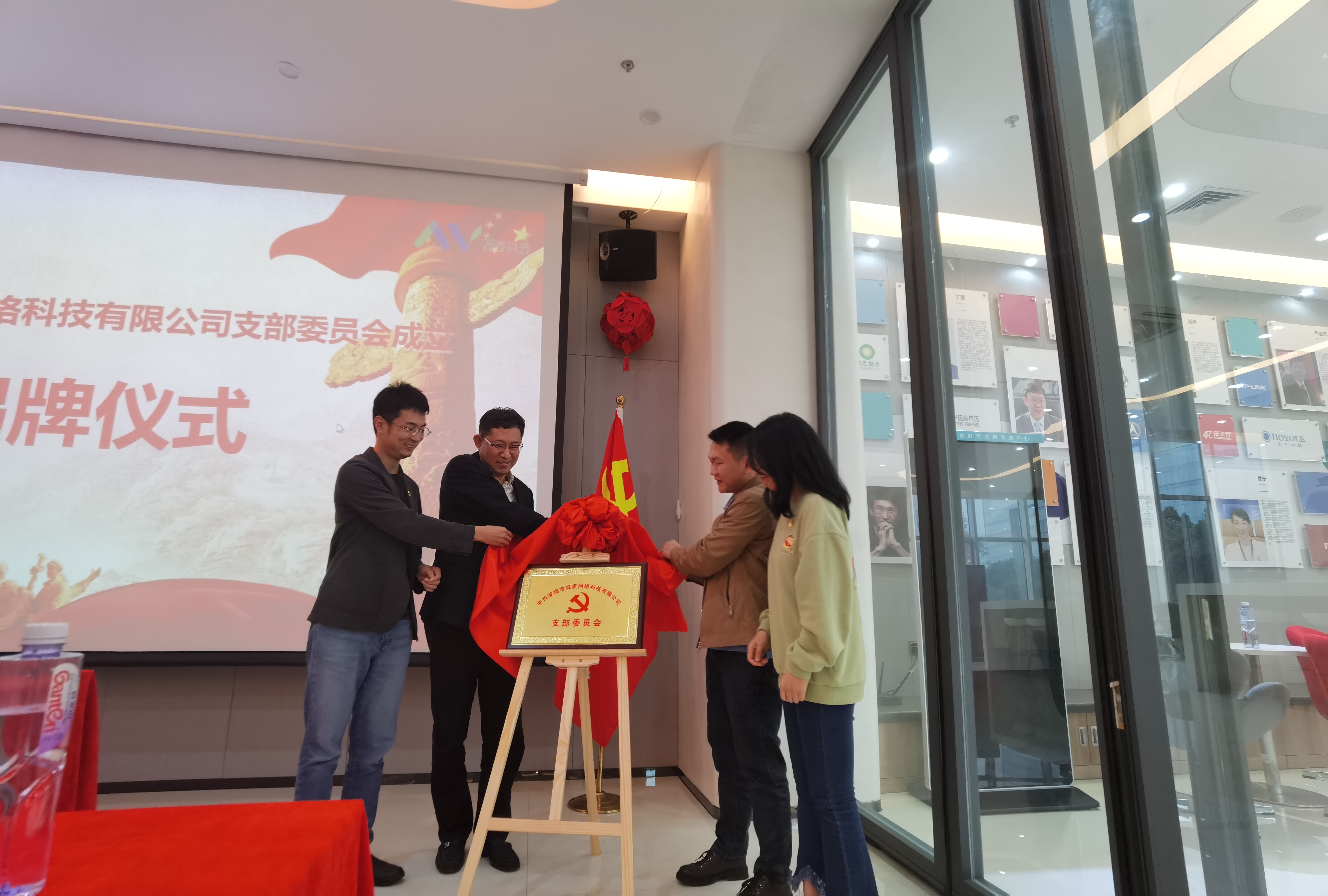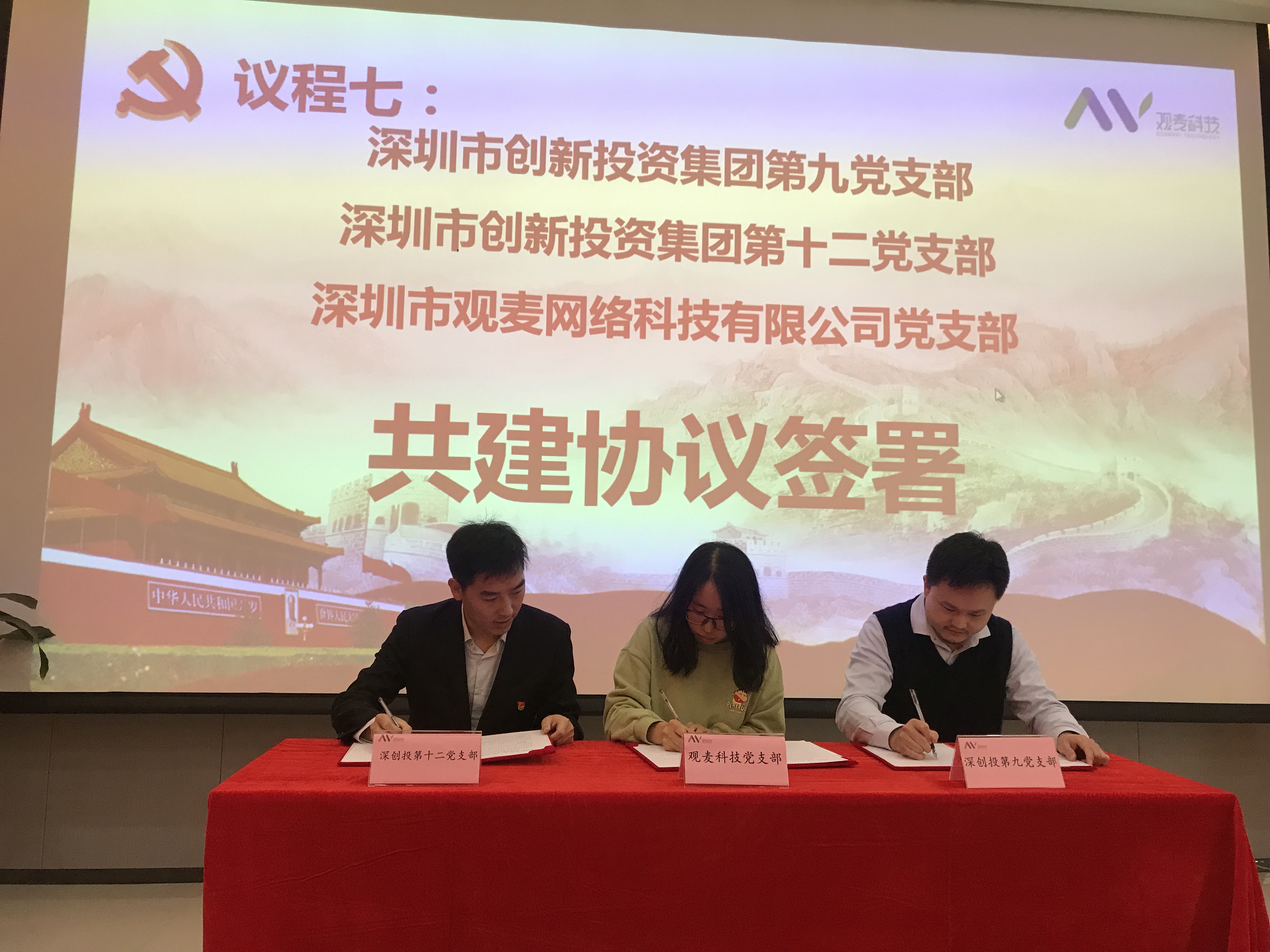 在全体党员的见证下,观麦网络党支部举行了成立揭牌仪式并与色色啦 第九、第十二党支部签订共建协议。三方党支部书记约定,今后将全力发挥各自的人才及资源优势,为双方企业的发展提供更多帮助。