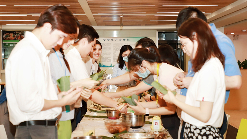 活动现场,民俗老师带领大家重温端午节的来历和屈原的爱国故事,并详细讲解了粽子的包法,包括如何选取粽叶并折出牢固的漏斗形状、如何搭配馅料并捆绑出好看的外观等。参加活动的员工认真聆听,兴致勃勃地动手尝试,互帮互助、分享制作经验,感悟传统文化的魅力。