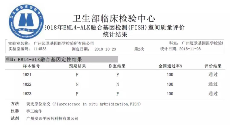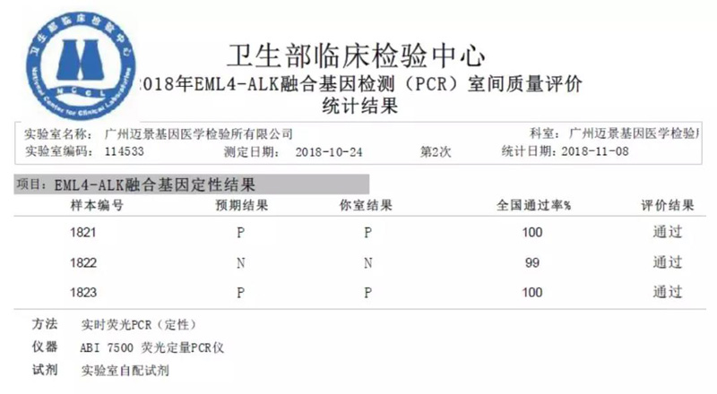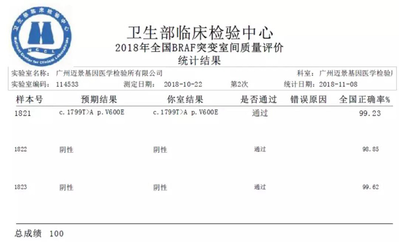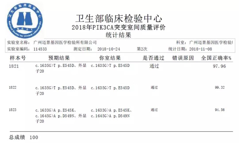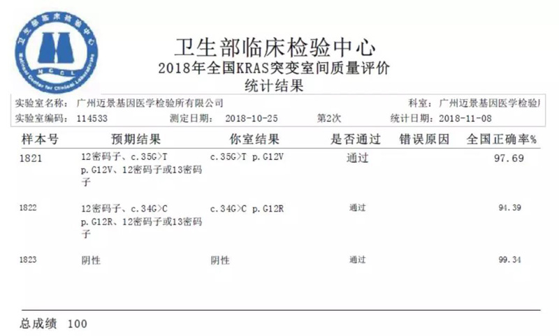 迈景基因再次满分通过2018年国家临检中心基因突变检测项目室间质评